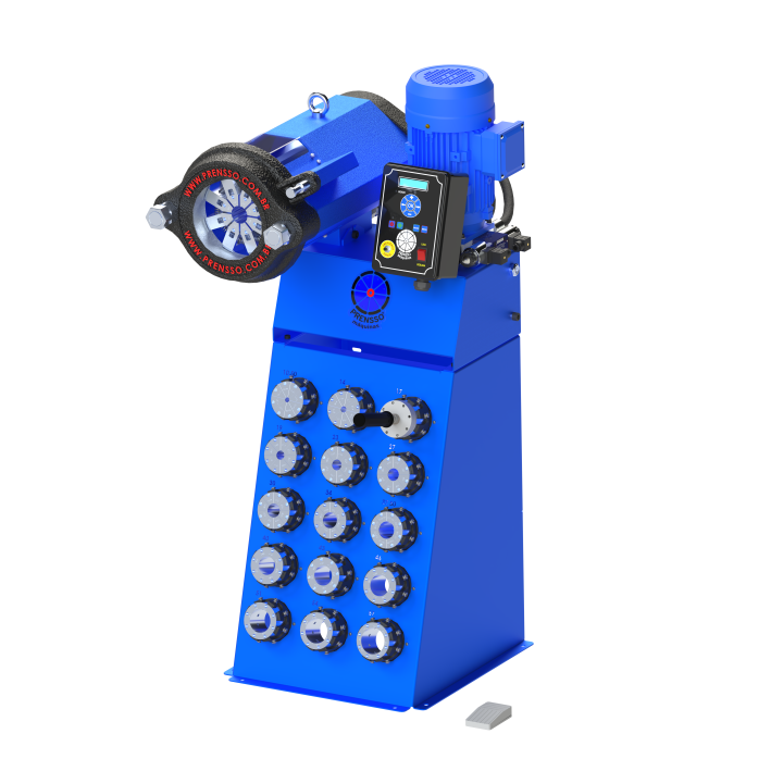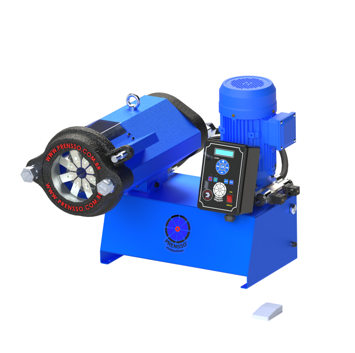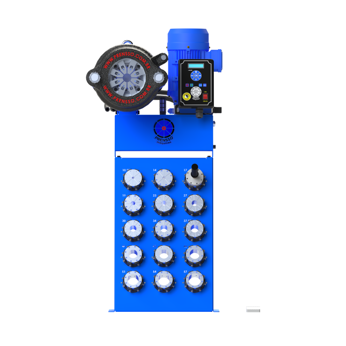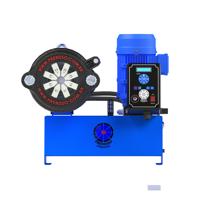 A prensa hidráulica PHV65 TFP prensa mangueiras hidráulicas de baixa, média e alta pressão entre 3/16” a 2” com 1, 2 e 4 tramas de aço e até 1” com 6 tramas de aço.